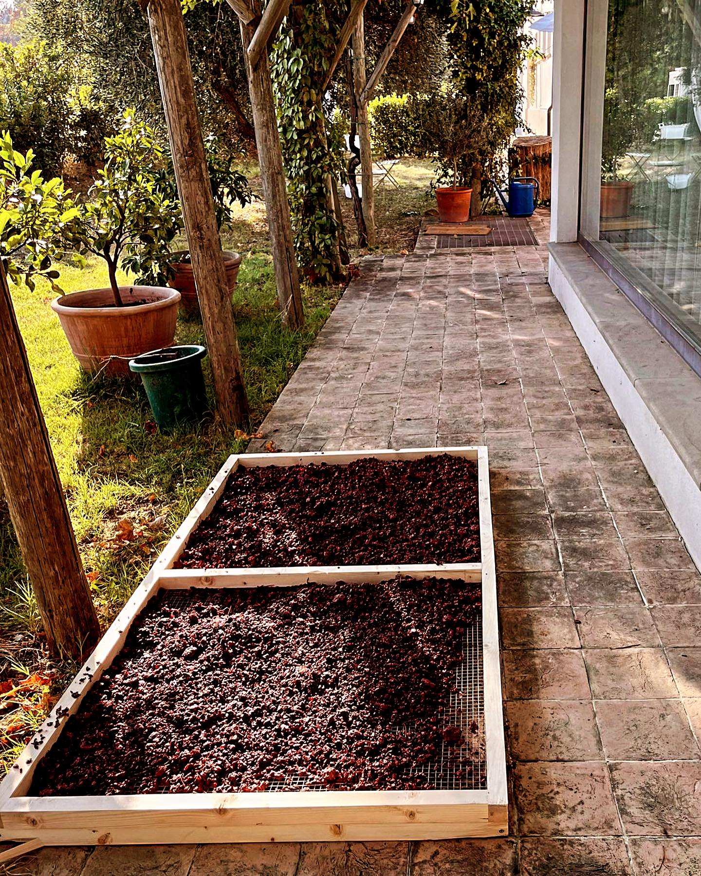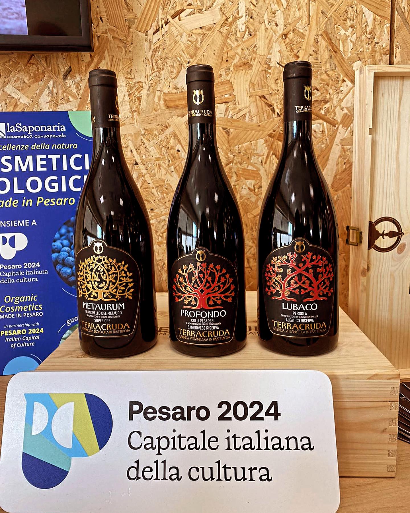 “Pietro, mio compagno di scuola, sapendo che sono proprietaria di una cantina, mi chiama e mi racconta che a sua volta ha un amico proprietario di un laboratorio artigianale di cosmetica consapevole a Pesaro e vuole produrre per PESARO CITTA’ DELLA CULTURA 2024 una limited edition. Questa edizione dedicata la vorrebbe realizzare con prodotti tipici e identificativi della provincia. Imprescindibile il fatto che le attività che collaboreranno debbono essere sostenibili, rispettose dell’ambiente, della biodiversità e biologiche. Sin da subito mi è piaciuta questa idea e l’ho accolta con interesse, racconta Emma. Così ci sentiamo con Luigi e Lucia proprietari del laboratorio artigianale Saponaria, subito ci intendiamo. Capisco che è un progetto lungimirante, uno di quei progetti che molto spesso la nostra cantina ha realizzato perché anche noi crediamo che la sinergia, le idee innovative, rispettose dell’ambiente siano il volano per la crescita sostenibile del territorio. A loro serviva dell’uva rossa e la scelta è ricaduta sul Rosso Pergola. A settembre durante la vendemmia abbiamo preso le vinacce dell’aleatico e, dopo aver costruito degli appositi graticci, le abbiamo messe al sole per circa un mese. Poi le vinacce di rosso Pergola di Terracruda sono state consegnate al laboratorio. Queste ultime insieme ad altri eccellenti prodotti del territorio il guado blu, la ginestra e l’olio DOP di Cartoceto sono stati la base per realizzare un sapone, uno shampoo un bagnoschiuma e una crema mani e corpo.”