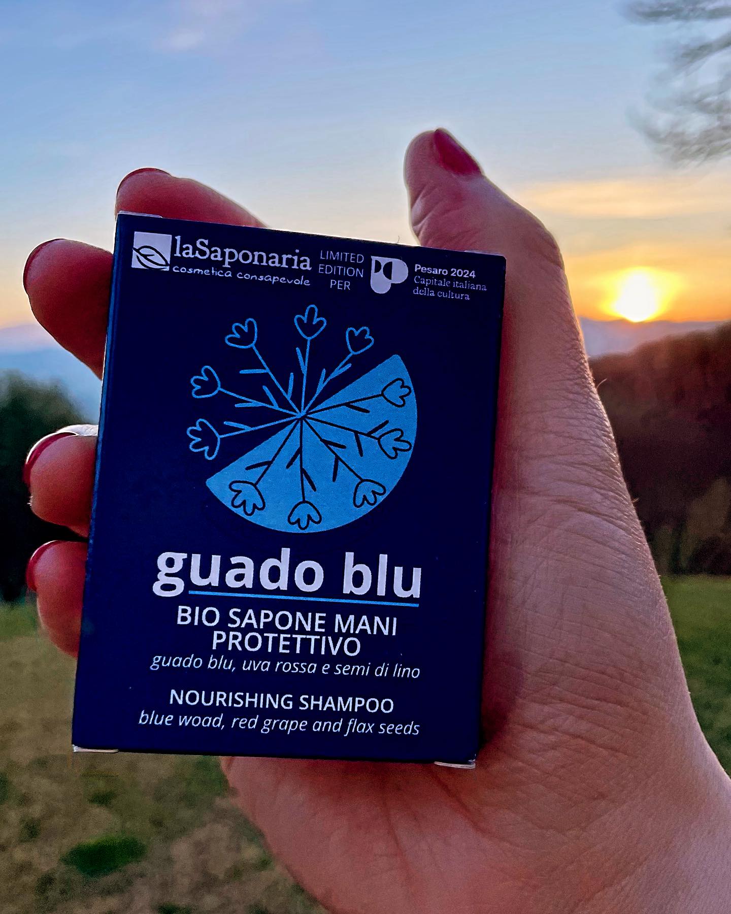Le vinacce dell’uva rossa, specificatamente del Rosso Pergola, sono state selezionate per la loro qualità e le proprietà benefiche. Questi sottoprodotti, insieme al guado blu, la ginestra, e l’olio dop di Cartoceto, sono stati trasformati in prodotti cosmetici eccezionali: sapone, shampoo, bagnoschiuma, e crema mani e corpo. Questi ingredienti, ricchi di storia e cultura, rappresentano l’anima del territorio e incarnano perfettamente il tema di Pesaro 2024: “la natura della cultura”.